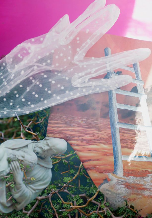 Using photography and fiction, it transmutes grief, longing, and alienation into spaces of restoration, resistance, and re-enchantment. The layered compositions invite viewers to contemplate allegorical landscapes shaped by journeys of body, mind, and spirit. These collaged tableaux act as conduits for ancestral linkages and folk imaginaries, weaving together fragmented narratives. Their universalist threads resist exclusionary logics of nativism and xenophobia that demonize those displaced by colonial conquest, economic precarity, and ecological collapse. Paired with a flash-fiction piece infused with magical realism, the series counters alienation by creating portals into interconnected worlds where individual and collective struggles are honored as part of a larger continuum, suffused with spectral traces across domestic spaces and landscapes.